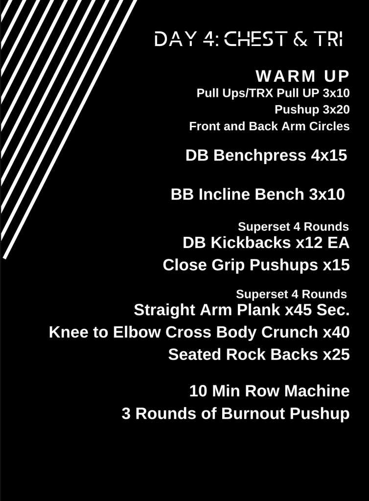 These are just thrown in because who doesn’t need a good little ab workout when you already have a gnarly chest pump going. Do these with as little break between sets as possible to get everything burning.